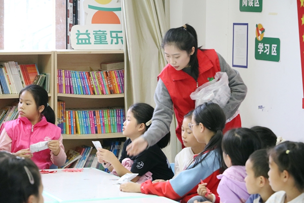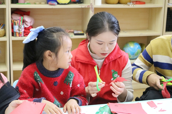 普法課程結(jié)束后,開展了富有傳統(tǒng)文化特色的趣味剪紙活動(dòng)。在剪紙活動(dòng)中,志愿者們耐心指導(dǎo)孩子們安全使用剪刀,學(xué)習(xí)剪紙技藝。小朋友們認(rèn)真折疊紅紙,精心裁剪,當(dāng)展開剪紙呈現(xiàn)出美麗的窗花圖案時(shí),臉上都洋溢著自豪的笑容。穿著紅色綠花小毛衣的王同學(xué)興奮地對志愿者老師們說:“我要把這個(gè)燕子窗花送給媽媽!”剪紙活動(dòng)不僅讓孩子們體驗(yàn)了動(dòng)手的樂趣,更成為他們表達(dá)情感與傳承文化的橋梁。